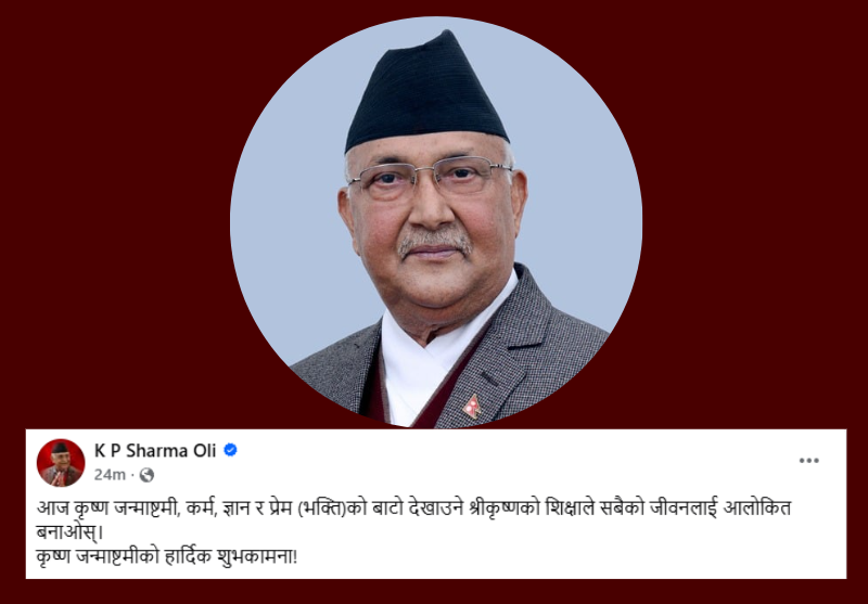 Read Moreकाठमाडौं । प्रधानमन्त्री केपी शर्मा ओलीले श्री कृष्ण जन्माष्टमीको अवसरमा शुभकामना व्यक्त गरेका छन् ।शनिबार सामाजिक सञ्जाल फेसबुक…