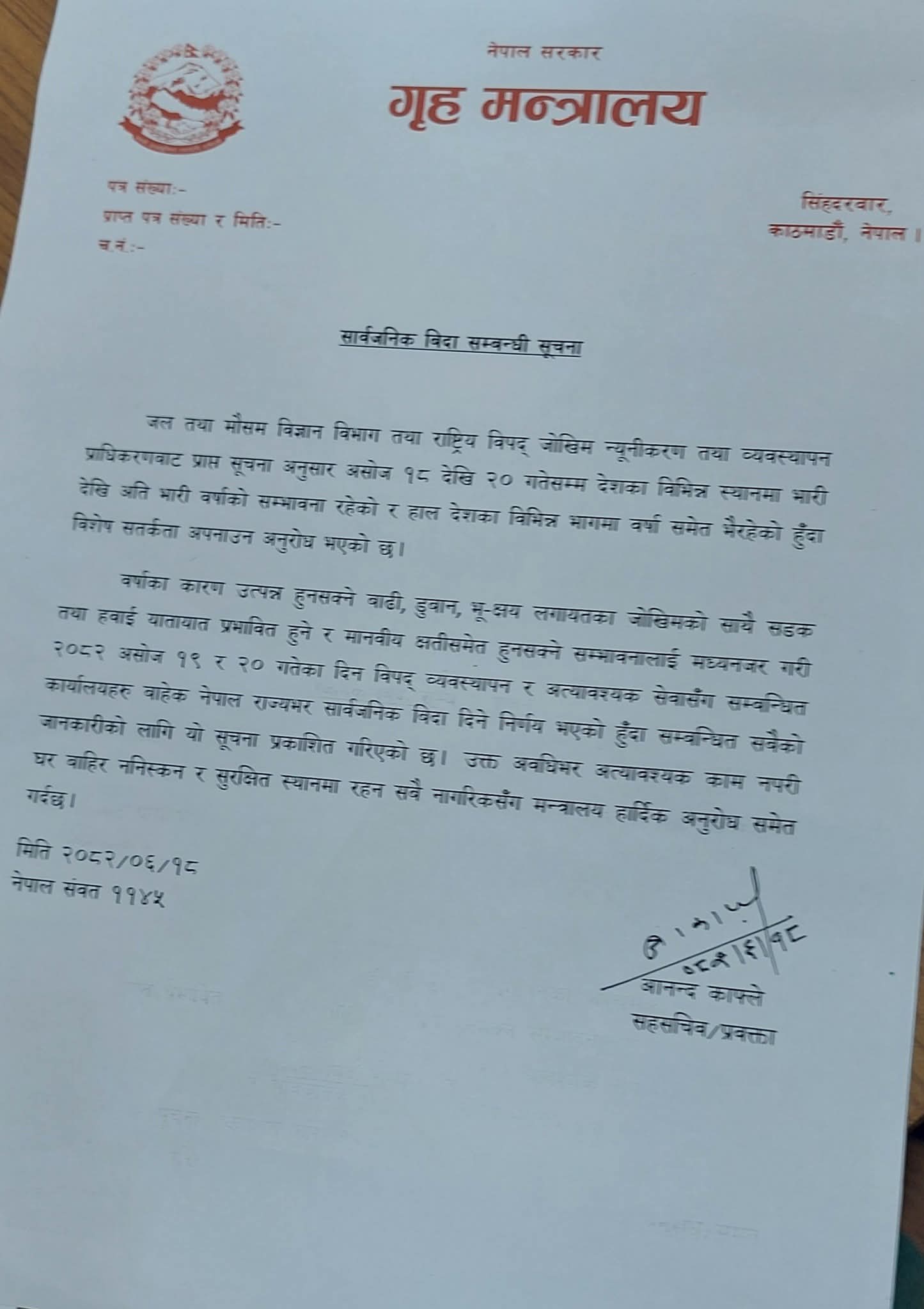 Read Moreकाठमाडौं । नेपाल सरकार, गृह मन्त्रालयले देशभर असोज १९ र २० गते (आइतबार र सोमबार) सार्वजनिक बिदा दिने…
