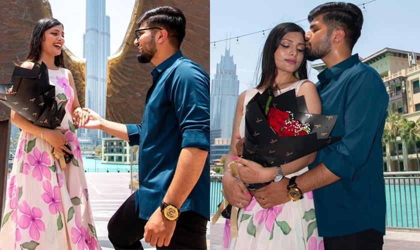 दुबईको बुर्ज खलिफाको सामुन्ने तस्बिर खिचाउँदै काफ्लेले लेखेका छन्, ‘सहयात्राको यो सुरुवात । हामी इन्गेज्ड भएका छौँ । अस्मिता अधिकारी आई लभ यू ।’