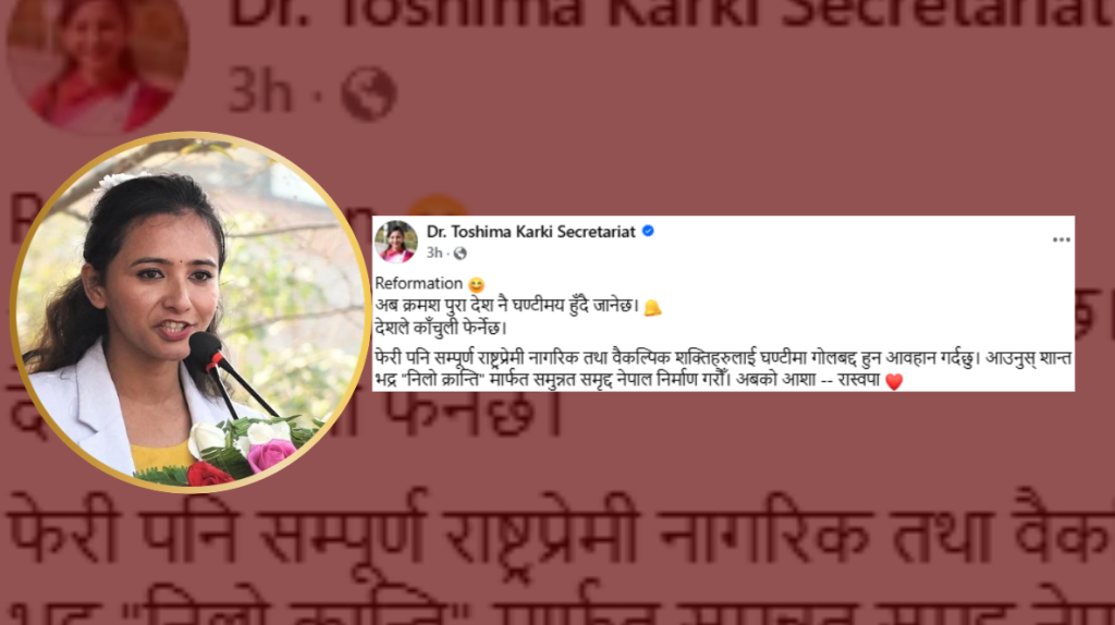 काठमाडौं । राष्ट्रिय स्वतन्त्र पार्टी (रास्वपा) की नेतृ तोसिमा कार्कीले अब मुलुक नयाँ दिशामा अघि बढ्ने बताएकी छन् ।