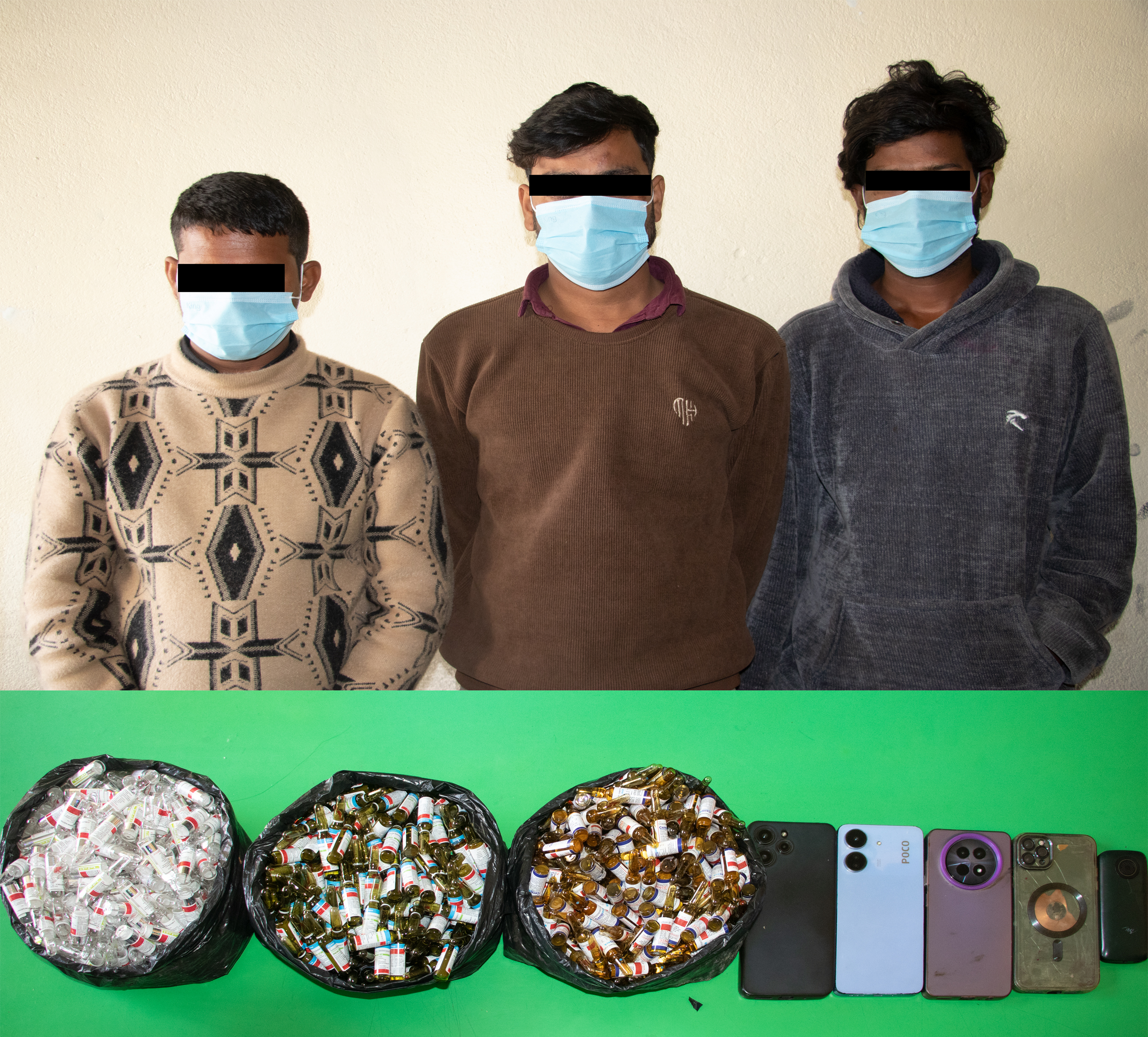 उनीहरुको साथबाट अवैध लागू औषध डाईजेपाम– दुईसय ६४ एम्पुल, बुर्फिननुर्फिन– दुईसय ६३ एम्पुल र फेनारगन– दुईसय ६५ एम्पुल गरी जम्मा साथ् सय ९२ एम्पुल लागू औषध, पांच थान मोबाईल पनि बरामद भएको प्रहरीले दाबी गरेको छ ।