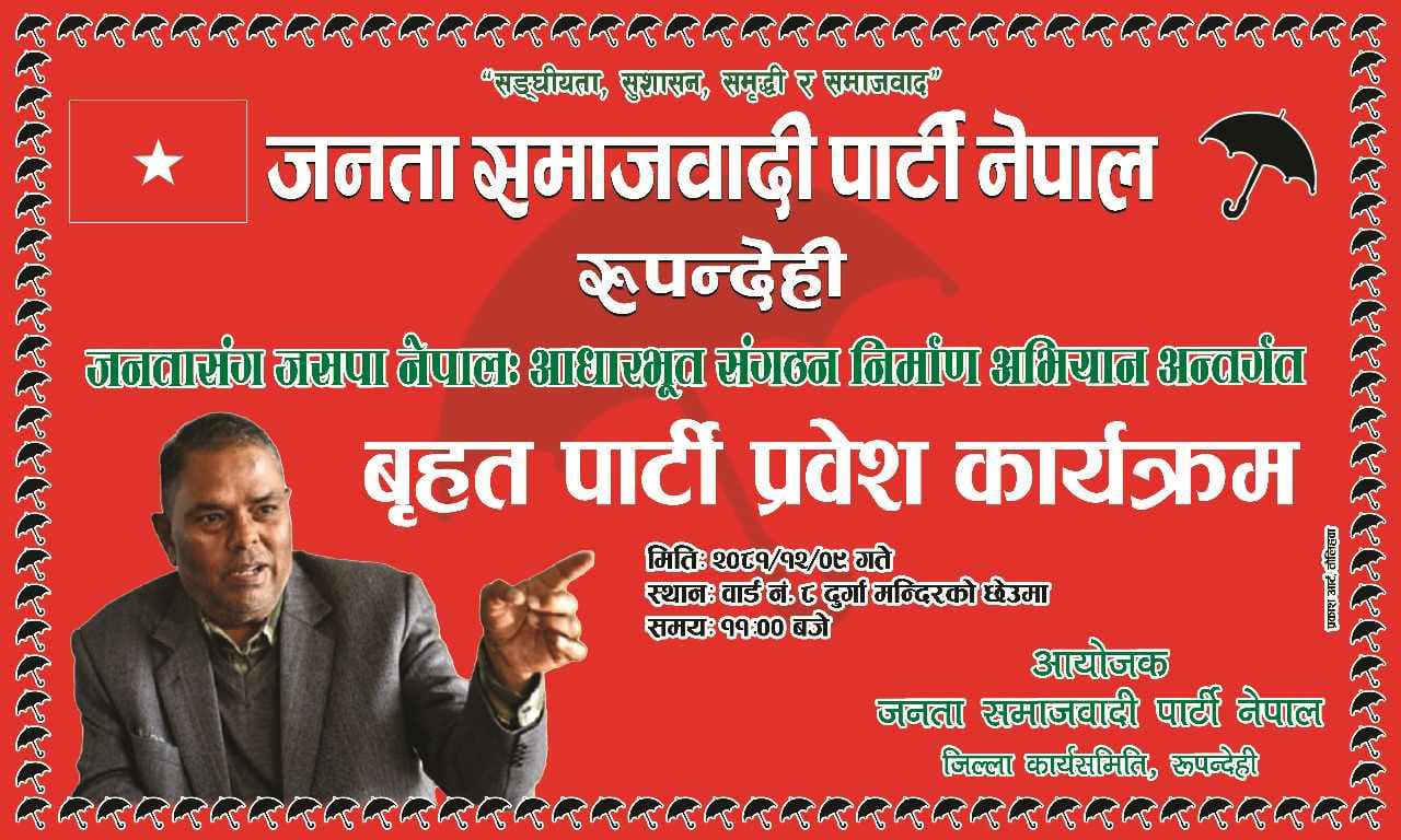 शनिबार ‘जनतासँग जसपा नेपाल, आधारभूत सङ्गठन निर्माण अभियान’ अन्तर्गत रुपन्देहीको भैरहवास्थित बुद्धचोकमा आयोजित बृहत् पार्टी प्रवेश कार्यक्रमलाई पार्टी अध्यक्ष उपेन्द्र यादवले प्रमुख वक्ताको रुपमा सम्बोधन गर्ने कार्यक्रम रहेको छ ।