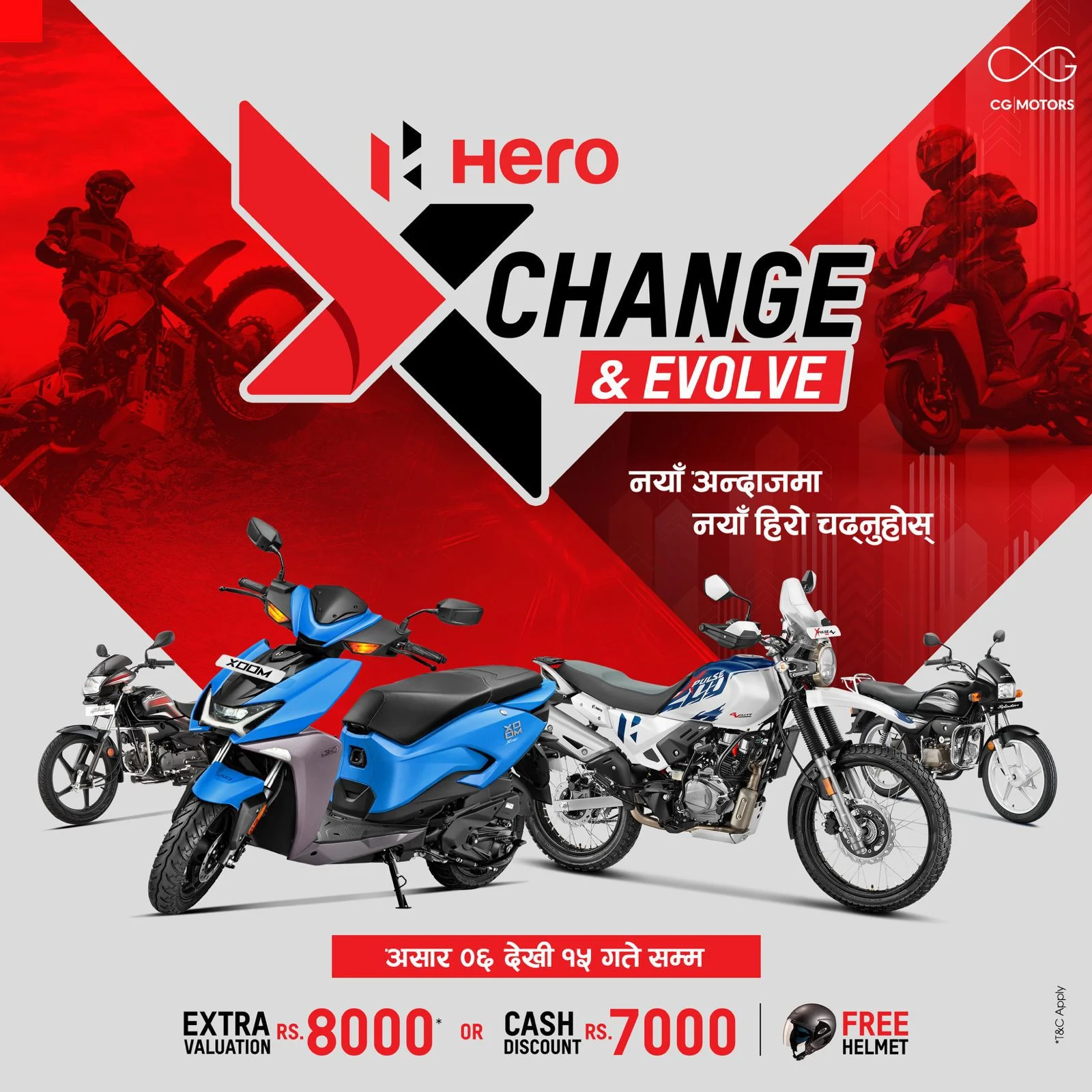 Read Moreकाठमाडौं । नेपालका लागि हिरो मोटोकर्पका आधिकारीक बिक्रेता सिजी मोटर्सले पहिलो पटक ‛हिरो एक्सचेञ्ज’ र इभल्भ सोरुम एक्सचेञ्ज…